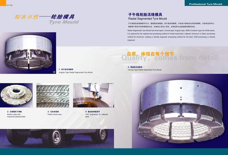 子午线轮胎活络模具可分为:圆锥面活络模具;斜平面活络模具;半自动平板硫化机用活络模具。内部花纹块可以根据客户要求可选用精铸铝合金、全钢电火花加工花纹,全钢或铝合金直接数控雕刻花纹。
